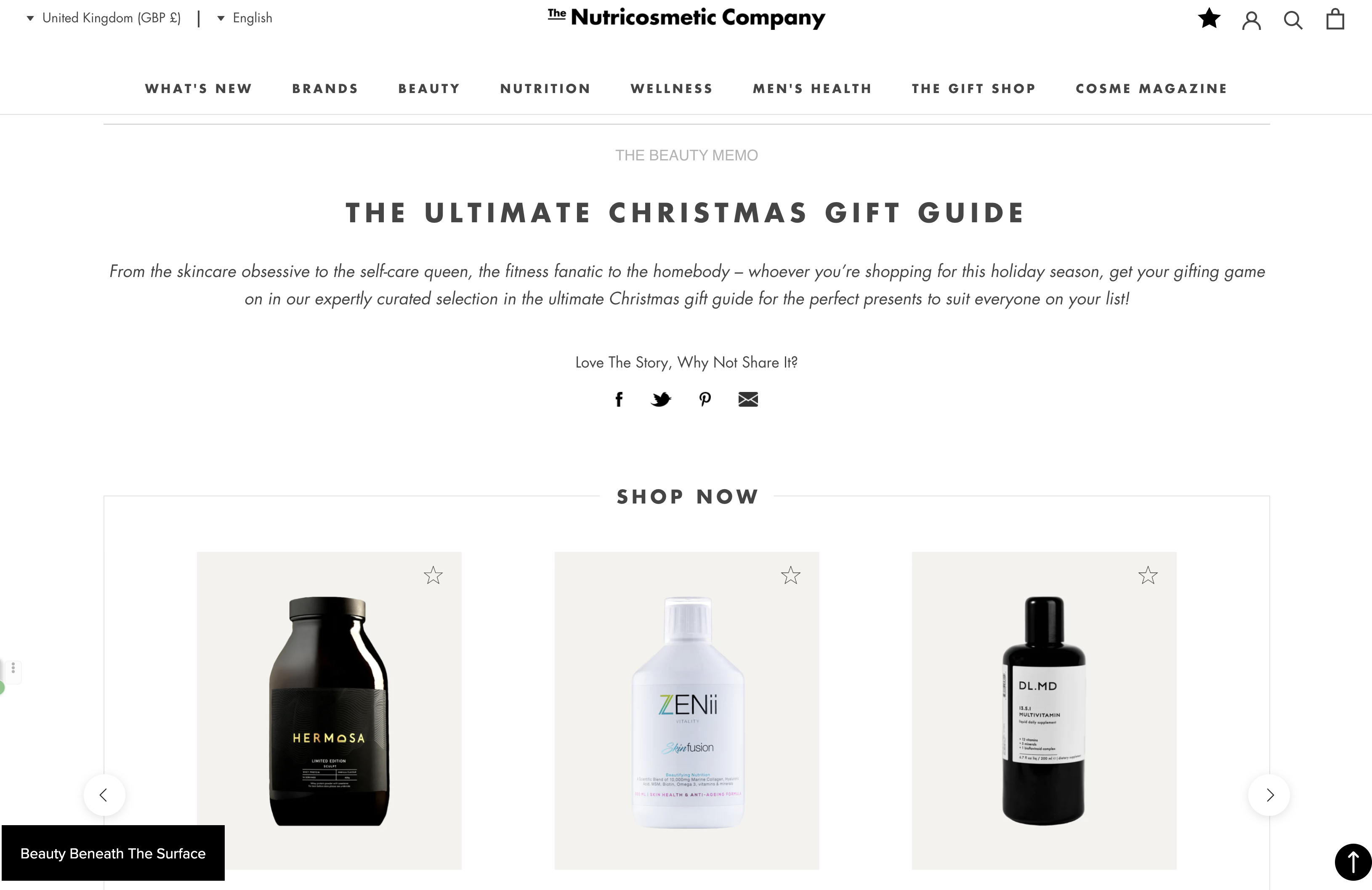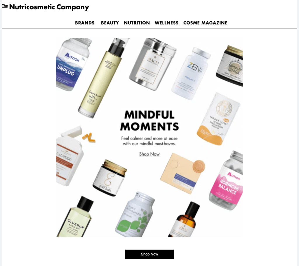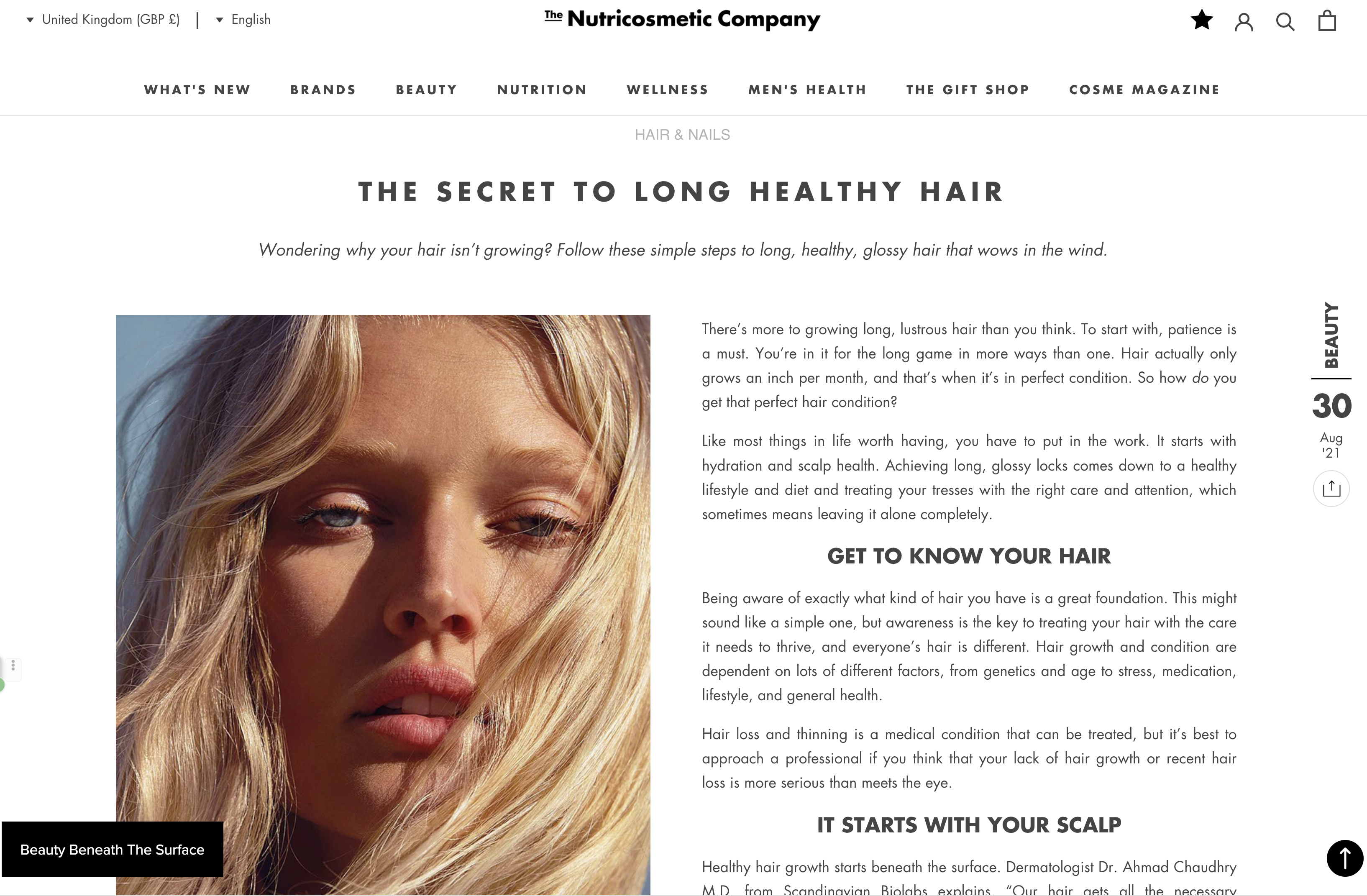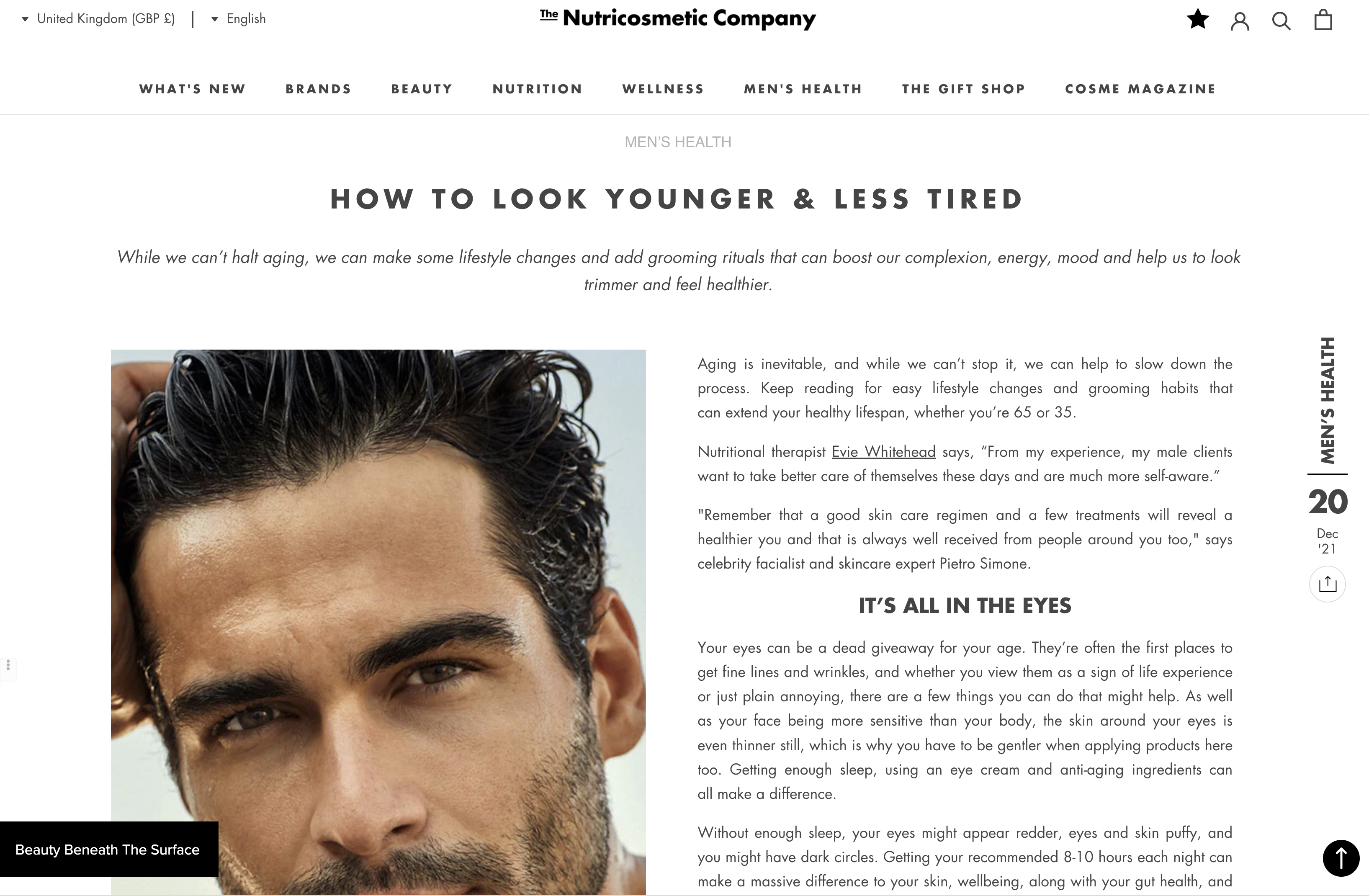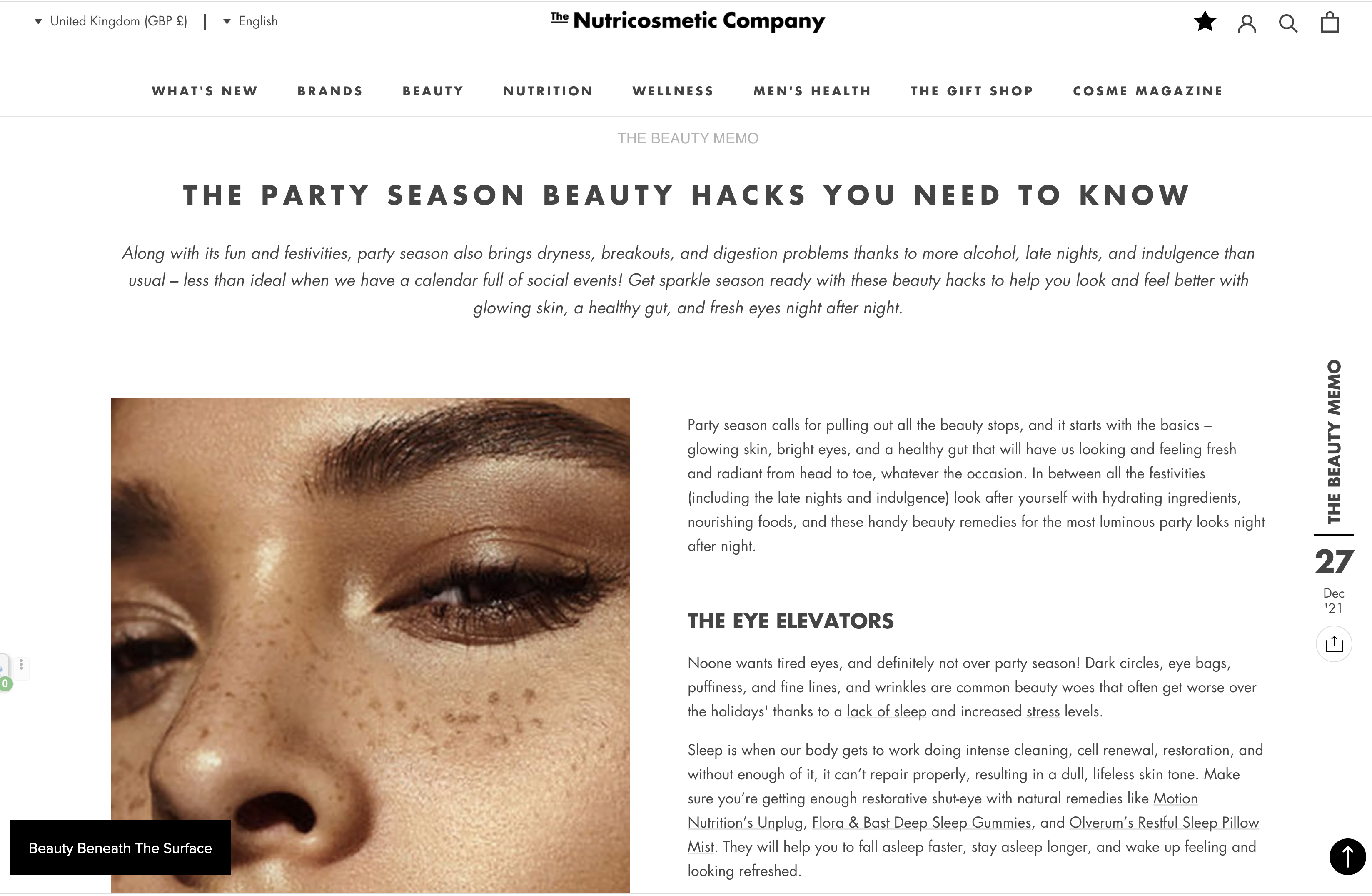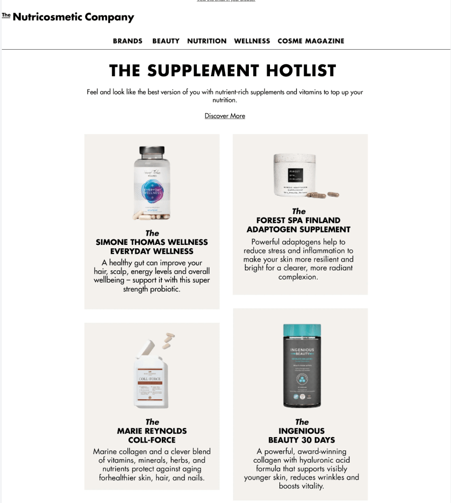 I contributed to the copy for each campaign we ran at The Nutricosmetic Company, including the Homepage copy, and the collection, campaign and brand descriptions.