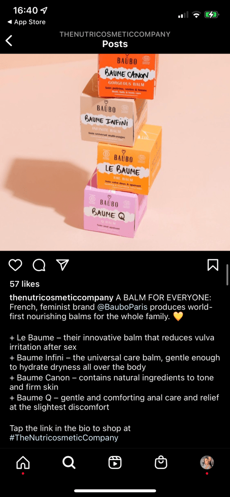 - BAÛBO – A sustainable, feminist brand that provides access to women’s personal care products including their revolutionary vulva balm.