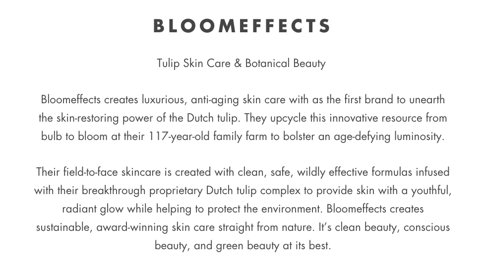 - Bloomeffects – Luxurious, anti-aging skincare, and the first skincare brand to utilise the skin-restoring Dutch tulip from field to face.