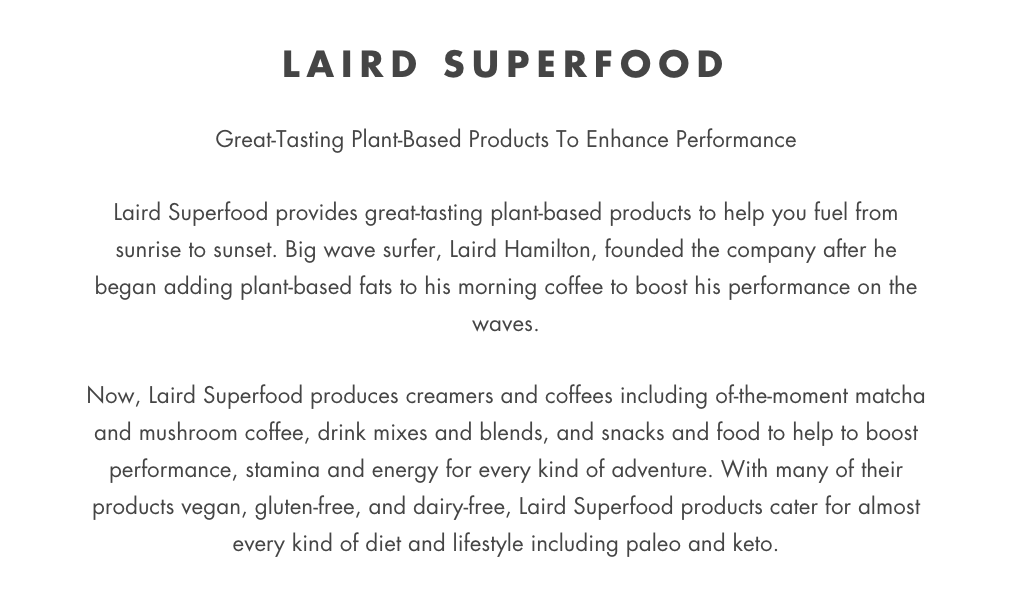 - Laird Superfood – Plant-based nutrition featuring of-the-moment ingredients like matcha, and mushroom coffee to fuel every adventure.
