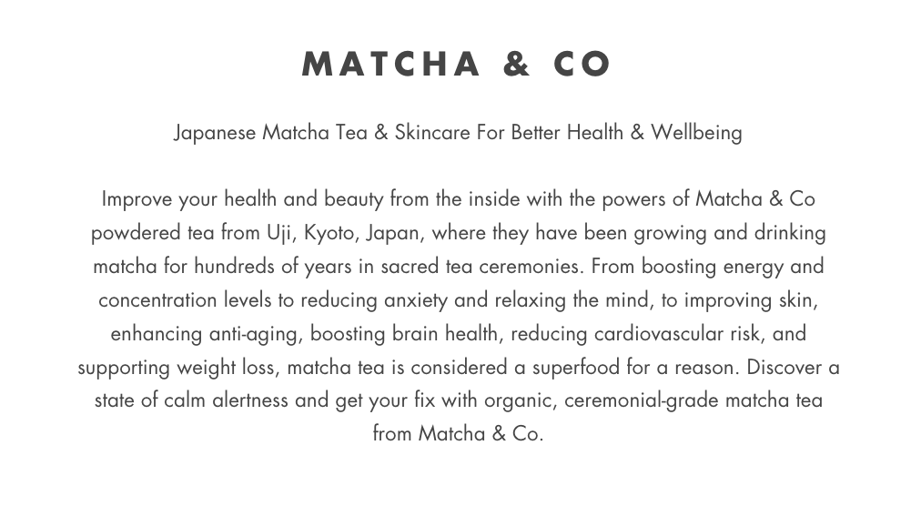- Matcha & Co – Traditional Japanese tea and skincare made with matcha tea to boost health and wellbeing.